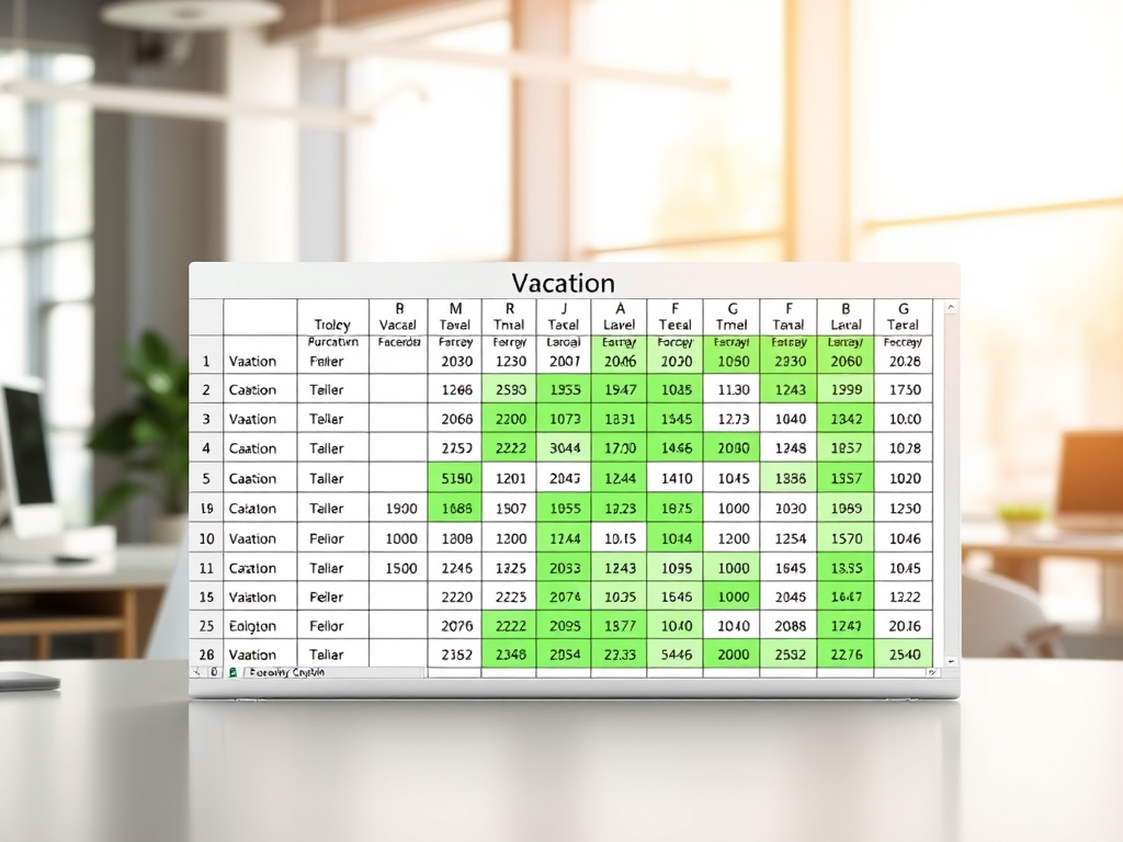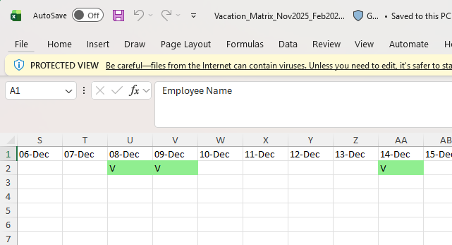 - Creates a new Excel file with the matrix, marking vacation days in green